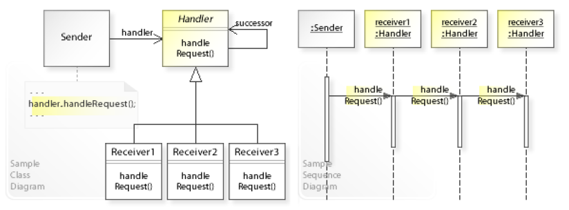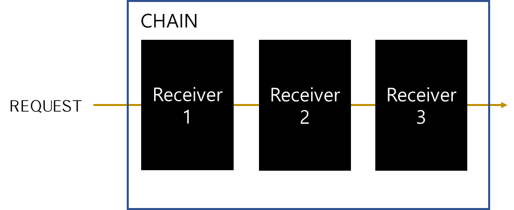 위 그림처럼 Receiver object들을 여러개 묶어 chain으로 만들어 놓고 요청에 대해서 각 처리하도록 한다.