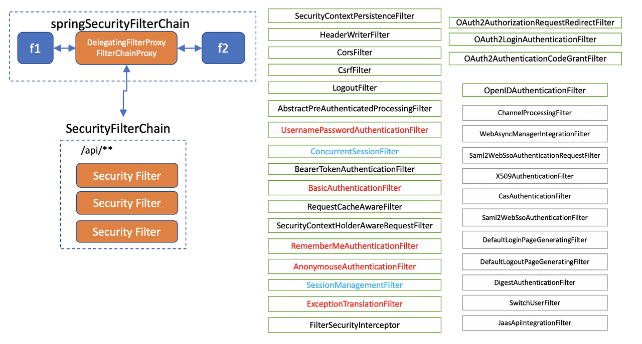 위 그림 처럼 /api/하위 FilterChain과 /admin/하위 FilterChain이 다를 수 있다. 만약에 공유하고 있다면 모든 FilterChain을 통과해야 하는 단점이 생긴다. proxy가 메인 필터 체인에 있고, proxy 하위에 SecurityFilterChain그룹을 등록하여 web resource 패턴이 다르더라도 필터를 무시하고 통과시켜줄 수 있다.