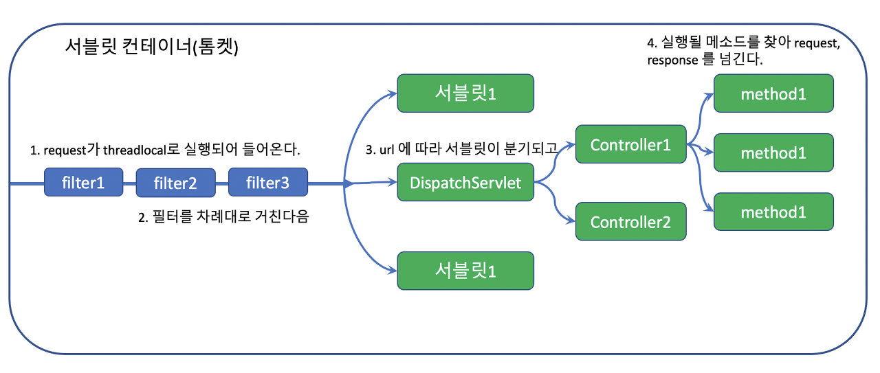 톰켓과 같은 웹 애플리케이션을 서블릿 컨테이너라고 부르는데, 이런 웹 애플리케이션(J2EE Application)은 기본적으로 필터와 서블릿으로 구성되어 있습니다.