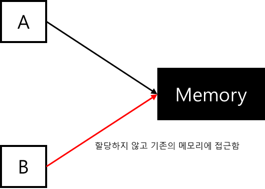 참조란 객체나 변수가 메모리를 생성하지 않고 기존에 존재하는 메모리에 접근하는 것이다.