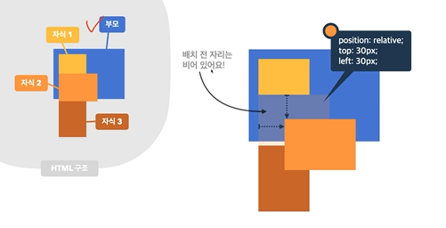 부모요소가 static으로 바뀌면서 상위요소 중 맨 첫 relative기준으로 배치된다.