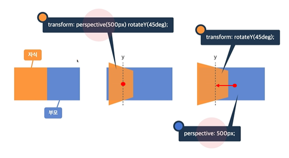 - perspective속성을 사용하게 되면 하위 요소의 관찰자가 되므로 하위 요소 변환의 중점이 된다.