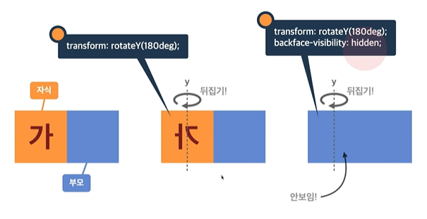 | backface-visibility | 3D 변환으로 회전된 요소의 뒷면 숨김 여부 | visible :뒷면 보임 hidden : 뒷면 숨김 |
