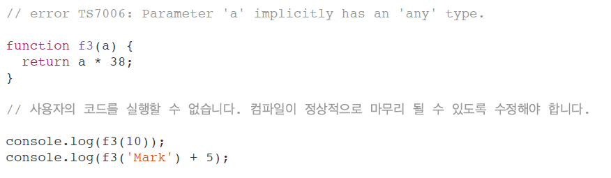 타입을 명시적으로 지정하지 않은 경우, 타입스크립트가 추론 중 `any`라고 판단하게 되면 컴파일 에러를 발생시켜 명시적으로 지정하도록 유도한다.
