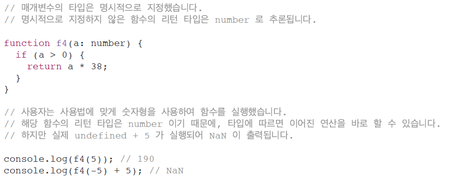 리턴타입을 명사하지 않으면 number | undefined로 추론되기 때문에 f4(-5) + 5는 연산 할 수 없어 컴파일 에러가 발생한다.