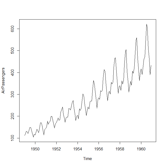 옆의 데이터는 AirPassengers라는 데이터로 R에 기본적으로 내장되어있는 데이터이다. x축은 Time이고, Y축은 고객의 수를 의미하는 것으로 볼 수 있다. 여기서 label 데이터처럼 시간과 고객의 수 관계를 확인해보려는 것이 아니라 과거의 특정 시간(구간)의 데이터를 통해 미래를 예측한다.