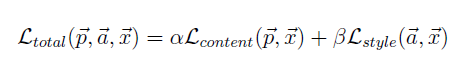 Style Loss function에서 새로운 개념인 Gram Matrix가 도입된다. Gram Matrix의 역할은 l층에 있는 Style Representation들의 서로 내적하여 하여 구한다. 즉, l층에 있는 모든 Style과 x사이의 Style Representation의 평균값을 구해 loss를 minimize해준다. wl은 어떤 층을 활성화 시킬것인지를 나타내주는 가중치이다. 위에서 말했듯이 여기서는 conv1_1, conv2_1, conv3_1, conv4_1, conv5_1만을 사용하였다. wl의 합은 항상 1이고, 각 층에 1/사용될 층의 개수(여기서는 5)만큼 주어진다.