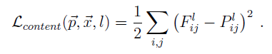 Content Loss function은 간단하다. x는 결과 이미지이고, p는 content이미지이다. F는 x를 통과시킨 l층에 있는 j위치에 있는 i번째 Feature map을 의미한다. P는 p를 통과시킨 l층 j위치에 있는 i번째 Feature map을 의미한다. Square Loss를 사용하여 단순히 Loss Function을 구성했다. 이 loss를 통해 x가 p로 수렴할 것임을 예측할 수 있다.