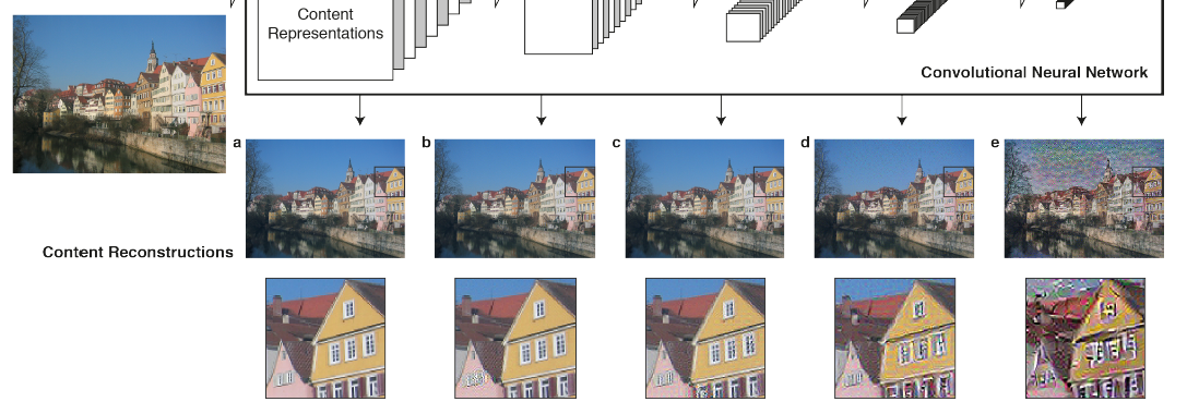 이제 Content에서 Feature들이 어떻게 움직이는지 보아야한다. a,b,c를 보면 원래의 사진과 거의 다를바가 없다. 하지만 깊은 층에 있는 사진을 보면 일부분이 사라져있는데 Feature은 남겨지고 그 외의 다른 픽셀(detailed pixel)들은 제거가 되어간다. Content Representation은 당연하다고 여기는 것들이 대부분이여서 이해하는데 쉽지 않다. 위에서 사람을 비유했을 때처럼 CNN을 통과하면서 T자부위와 얼굴형에 Feature들이 남는 거처럼 Content이미지에서 해당 Object를 구별하기 위한 고유한(별표 무한개~)특징들만 남기고 나머지는 사라지게 된다. 결과를 보면 알수 있듯이 Content에서는 사물을 알아보기 위한 Feature들이 남게 된다.
