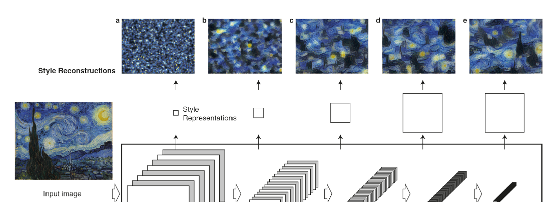 Representation이라는 용어는 각 층(Multi-scaled)에서 나오는 Feature map(실제로 Transfer에 사용될)들의 집합을 의미한다. 먼저 Style의 Feature부터 확인을 해보자! 앞쪽이 얕은(shallow)한 층이고 뒤쪽이 깊은(Deep) 층이다. 그러면 CNN에서 Feature를 추출해 내는 데 그림에게 있어서 Feature는 무엇일까? 결론부터 말하면 최종적인 산물(output)은 텍스쳐를 생산한다. 이 논문에서는 Style Represenation에서는 원래 그림의 전체적인 배열(global arrangement)은 점차 사라지고 반복되는(Texturised) 색감과 구조를 고유한 특성(Feature)을 추출한다는 것을 확인하였다.