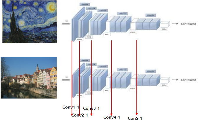 Artistic Style Transfer는 구조가 비교적 쉽다. VGG19가 나란히 2개로 되어 있는 모델이다. 각 층에서 나오는 합성된 이미지를 하나씩 선택한다. 그래서 얕은 층부터 깊은 층까지 있는 합성된 사진에서 관찰되는 이미지를 가지고 한개의 합성된 이미지를 만든다. 논문에서는 conv1_1, conv2_1, conv3_1, conv4_1, conv5_1의 사진을 사용하였으며 다른 위치에 있는 이미지를 사용하여도 상관없다.