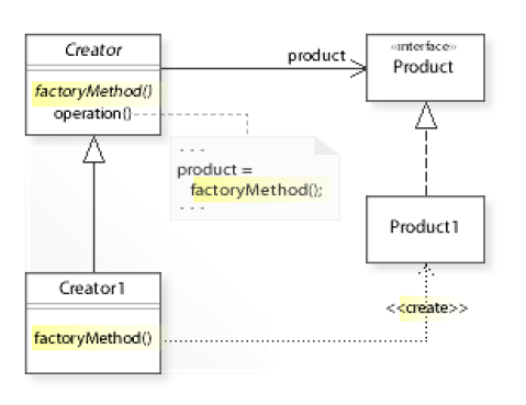 결합을 느슨하기 위해 Creator Interface를 상속받아 Creator1을 만들고 factoryMethod내에 new Product1을 사용한다.