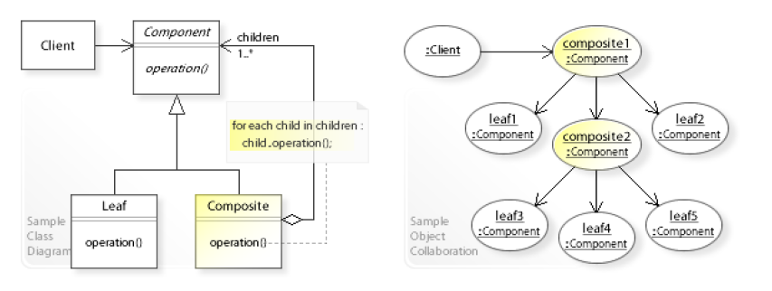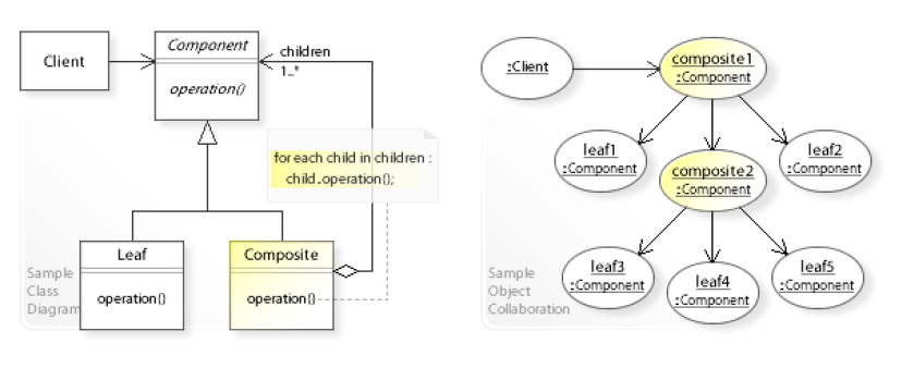 Tree구조는 OOP syetem에서 매우 자주 사용하기 때문에 composite는 패턴은 유용하다. Tree구조는 Leaf Object와 Composite object로 구성되어 있다. Leaf Object는 Leaf Node와 같은 역할을 한다고 보면되고 Composite object는 중간 Node이라고 보면 된다. 그래서 Composite object는 children을 가질 수 있다. Client는 Object들을 균일하게 사용하기 위해서 interface를 활용하는데 client입장에서는 구현, 수정, 테스트, 재사용하기 편하다.